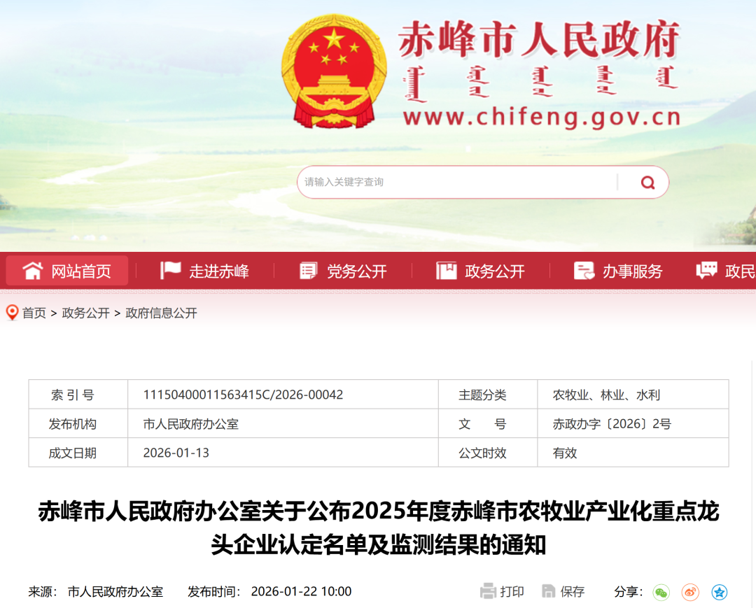 为进一步推进农牧业产业化经营和龙头企业发展,根据《赤峰市农牧业产业化重点龙头企业认定和运行监测管理办法》(赤农牧产发〔2021〕26号)要求,我市组织开展了2025年度赤峰市农牧业产业化重点龙头企业申报及监测工作。经企业申报、旗县区人民政府推荐、实地核查、会议评审、网上公示,现将28家新认定企业名单、107家监测合格企业名单、41家监测不合格企业名单予以公布。