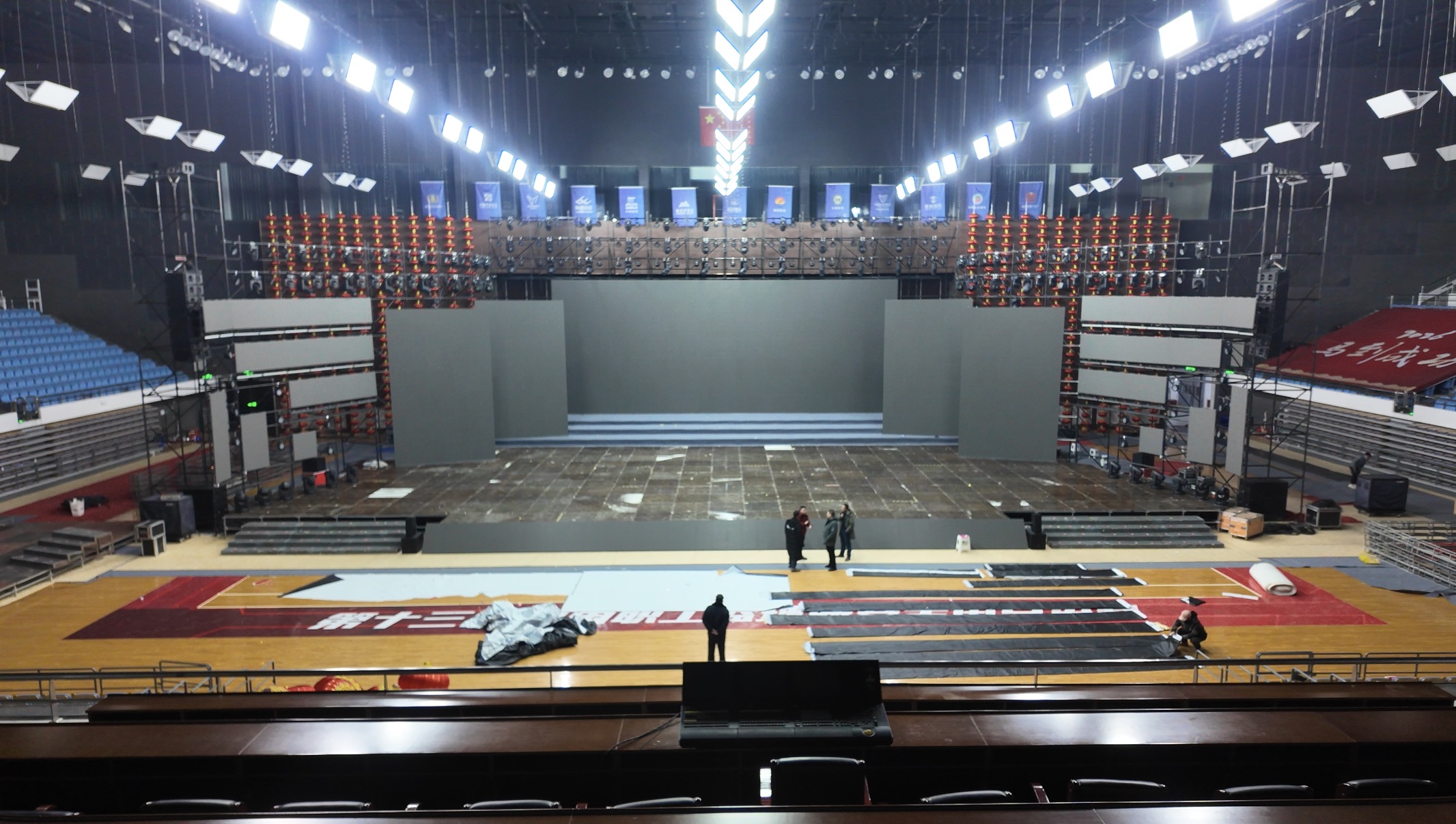 2月3日上午,在赤峰体育一中心体育馆记者看到,2026年赤峰春晚的舞台已完整矗立在场馆中央,灯光、音响也按部就班排列整齐,工作人员正在安装观众席舞美幕布。