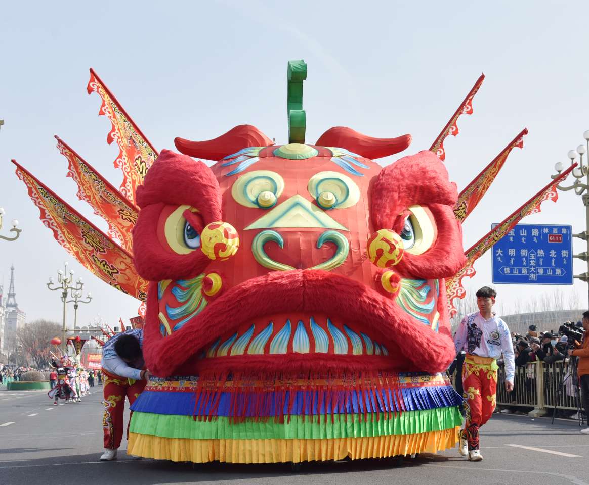 在八方来客竞相献艺的同时,赤峰本土的巡游队伍同样光彩夺目,展现出深厚的地方文化底蕴与创新活力。赤峰蒙宴花车以恢弘雅致的造型,搭载的蒙宴艺术团以歌舞为媒介,生动演绎着赤峰故事,彰显了本土企业深耕文化、赋能文旅的独特风采。赤峰舞狮协会狮义堂龙狮团震撼登场,3.8米的巨型赤峰雄狮与20米长的金龙翻腾起舞,气势磅礴,尽显北疆非遗的威武雄风。尤为引人注目的是,玉龙英歌队携内蒙古首支女子英歌队惊艳亮相,这支成立不到一年的队伍,特邀广东非遗传承人亲授,将潮汕英歌舞原始的“力与势”完美移植,在北疆大地上舞出了铿锵激昂的巾帼风采,成为传统艺术跨地域传承与创新的生动典范。