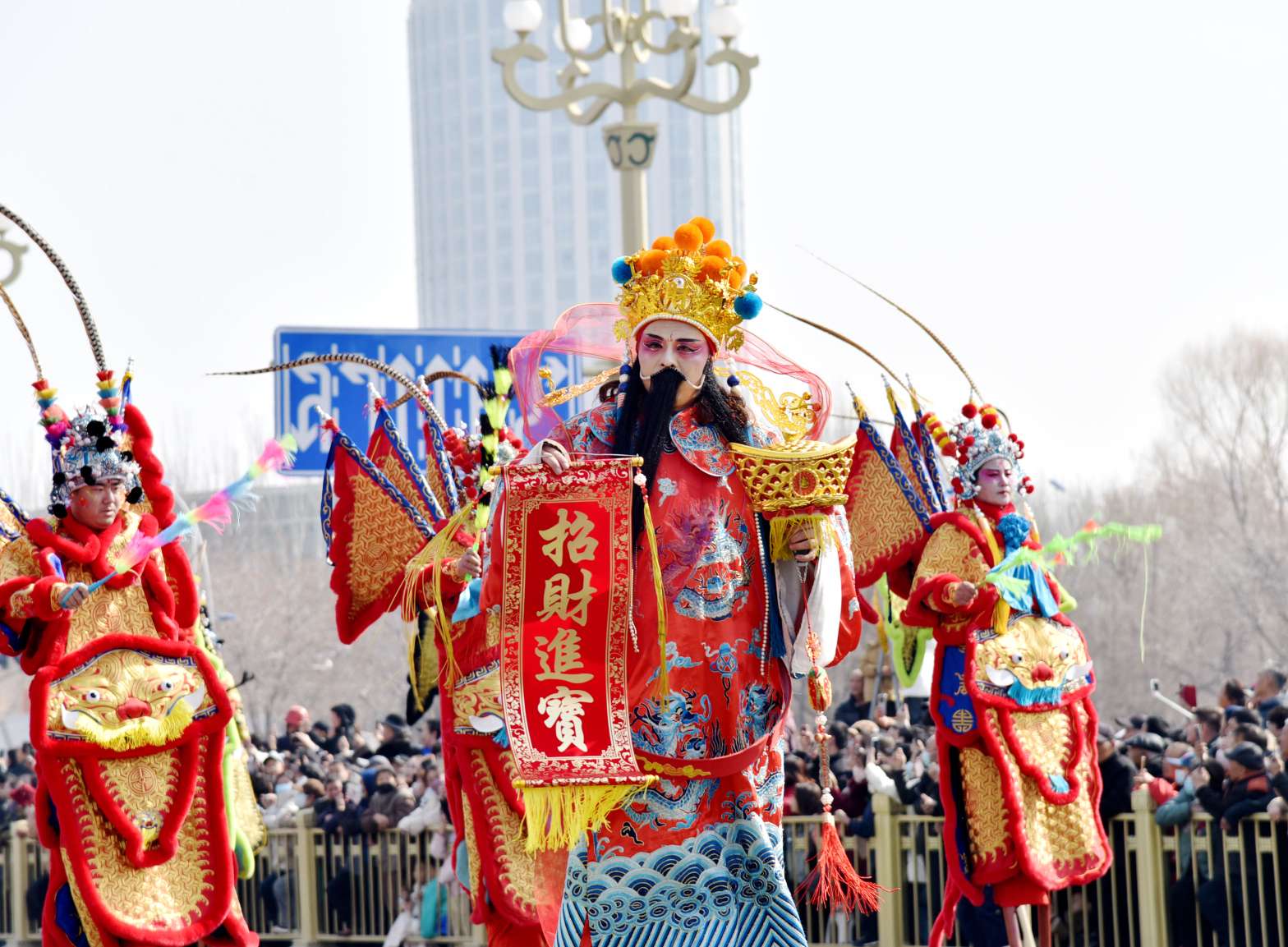 9时58分,一位精神矍铄的老者,携祥龙瑞狮,向赤峰人民送上深情祝福。随着开场祈福完毕,巡游正式拉开序幕。霎时间,锣鼓喧天,旌旗招展,一条长达两公里的流动“非遗高跷画廊”沿玉龙大街浩荡铺开。