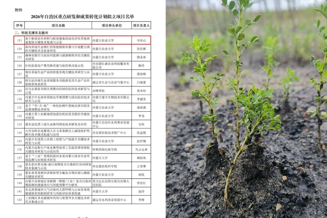 记者从克什克腾旗林草局获悉,近日,由该旗林草局、托河林场与内蒙古农业大学技术团队协同实施的“基于新质仿生材料与配套装备的退化沙化草地快速复绿关键技术集成与示范”项目,成功入选《2026年自治区重点研发和成果转化计划(科技支撑东北振兴)立项名单》,并获得自治区科技厅100万元专项资金支持。