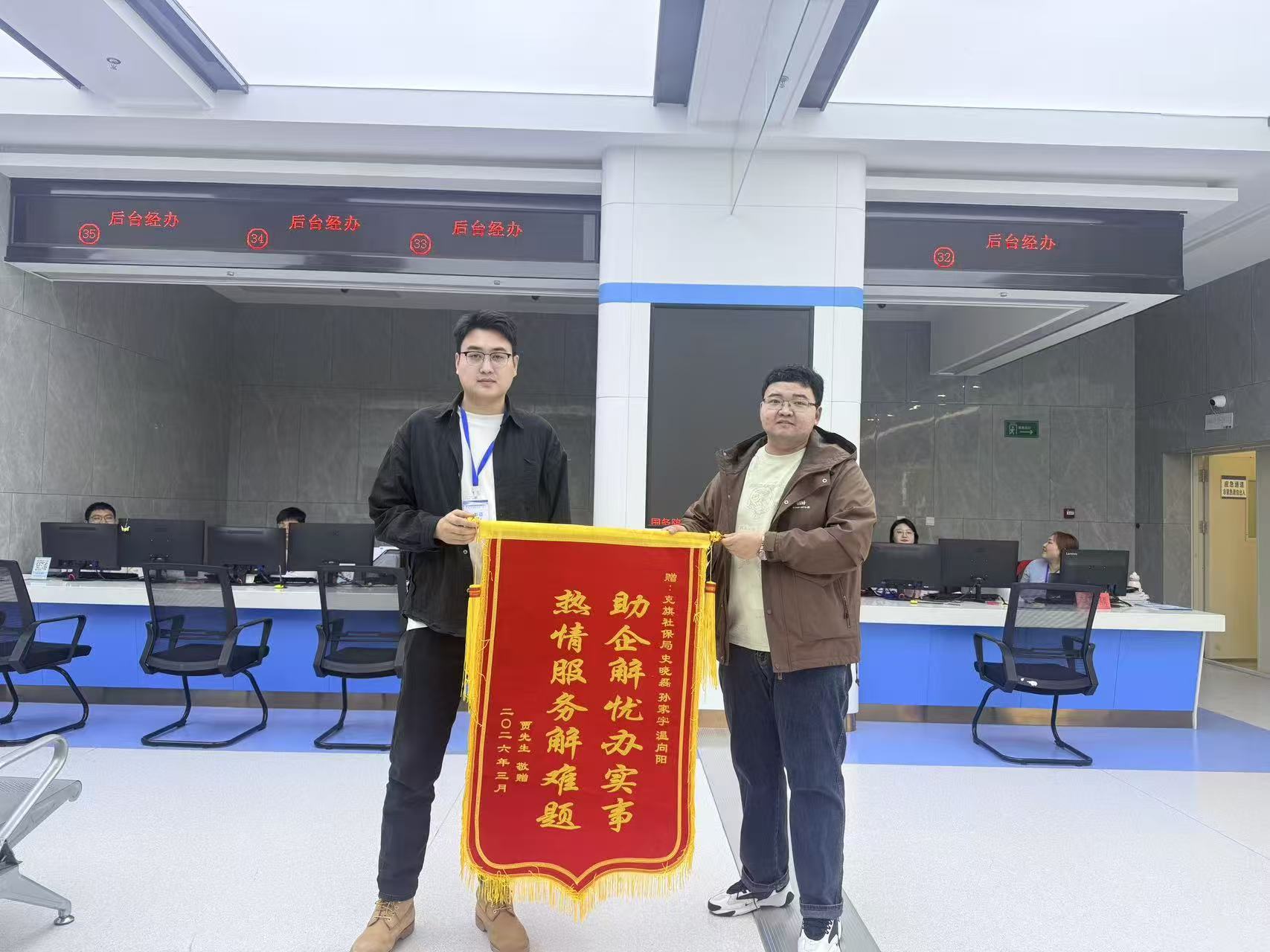 近日,克什克腾旗某企业负责人贾先生专程来到克什克腾旗政务服务大厅社保窗口,将一面写有“助企解忧办实事,热情服务解难题”的锦旗送到工作人员手中,对窗口办事效率和服务态度表示感谢。这面锦旗不仅是对社保窗口服务工作的高度肯定,更是优化营商环境、提升政务服务效能的生动实践。