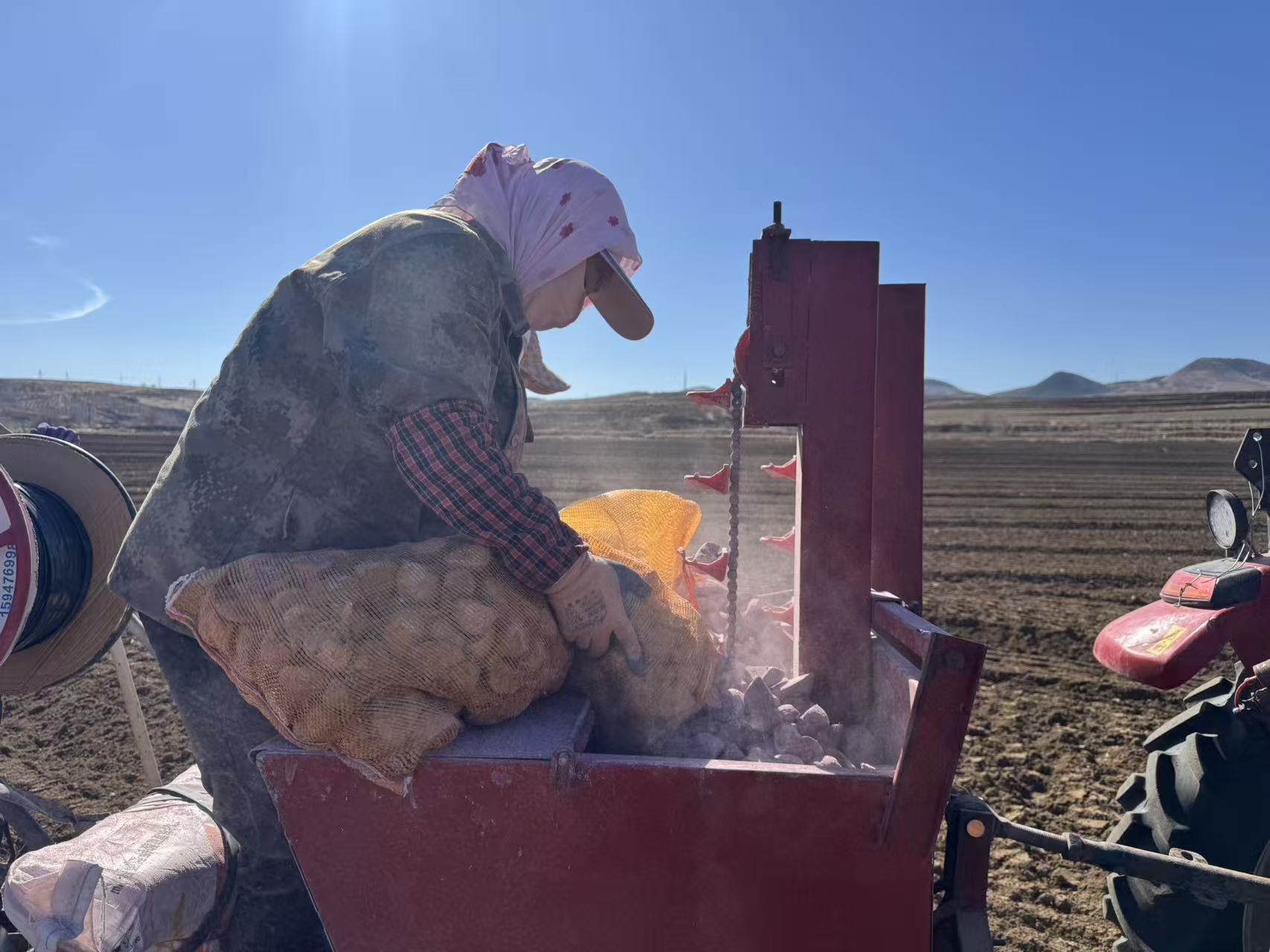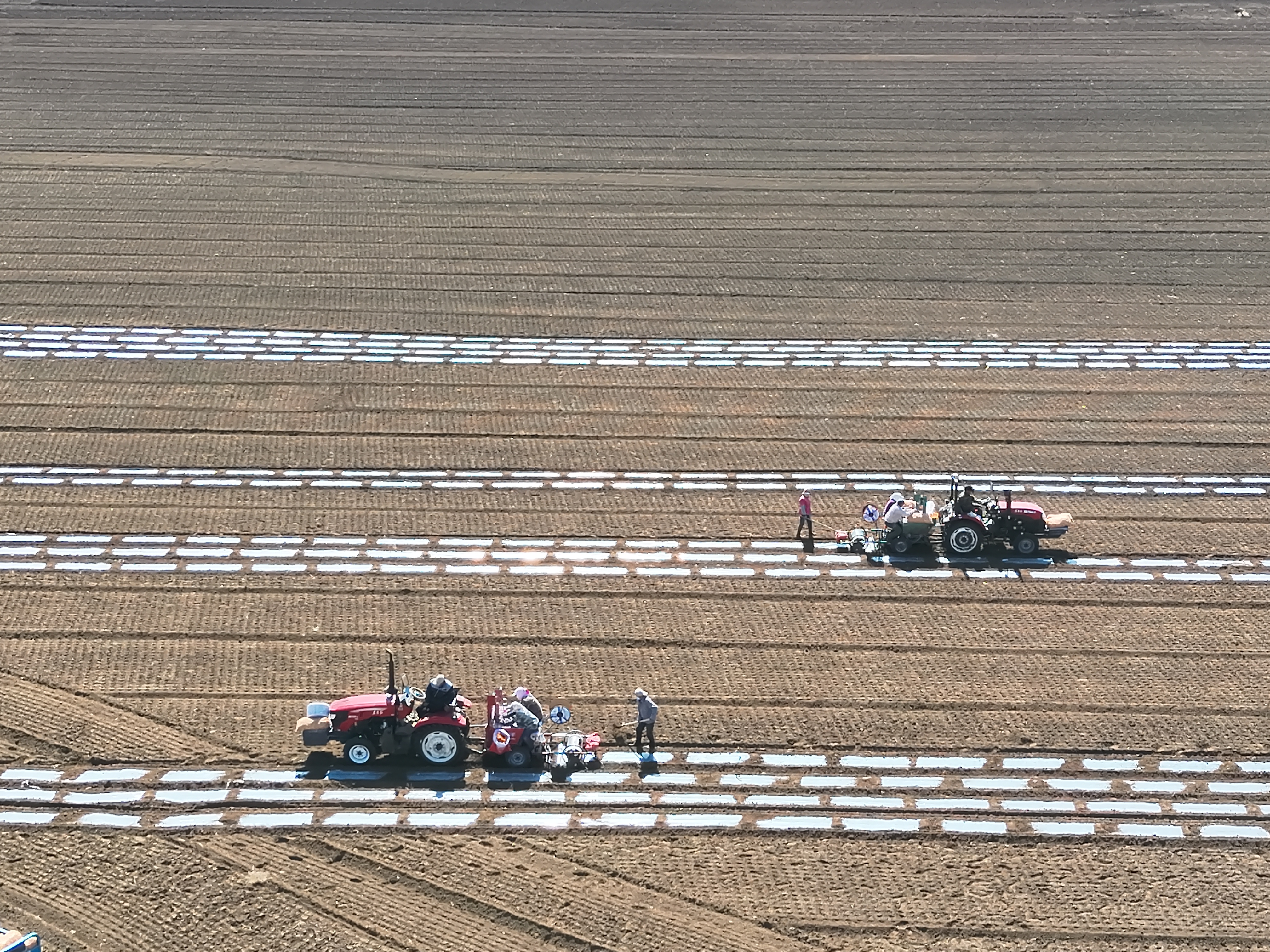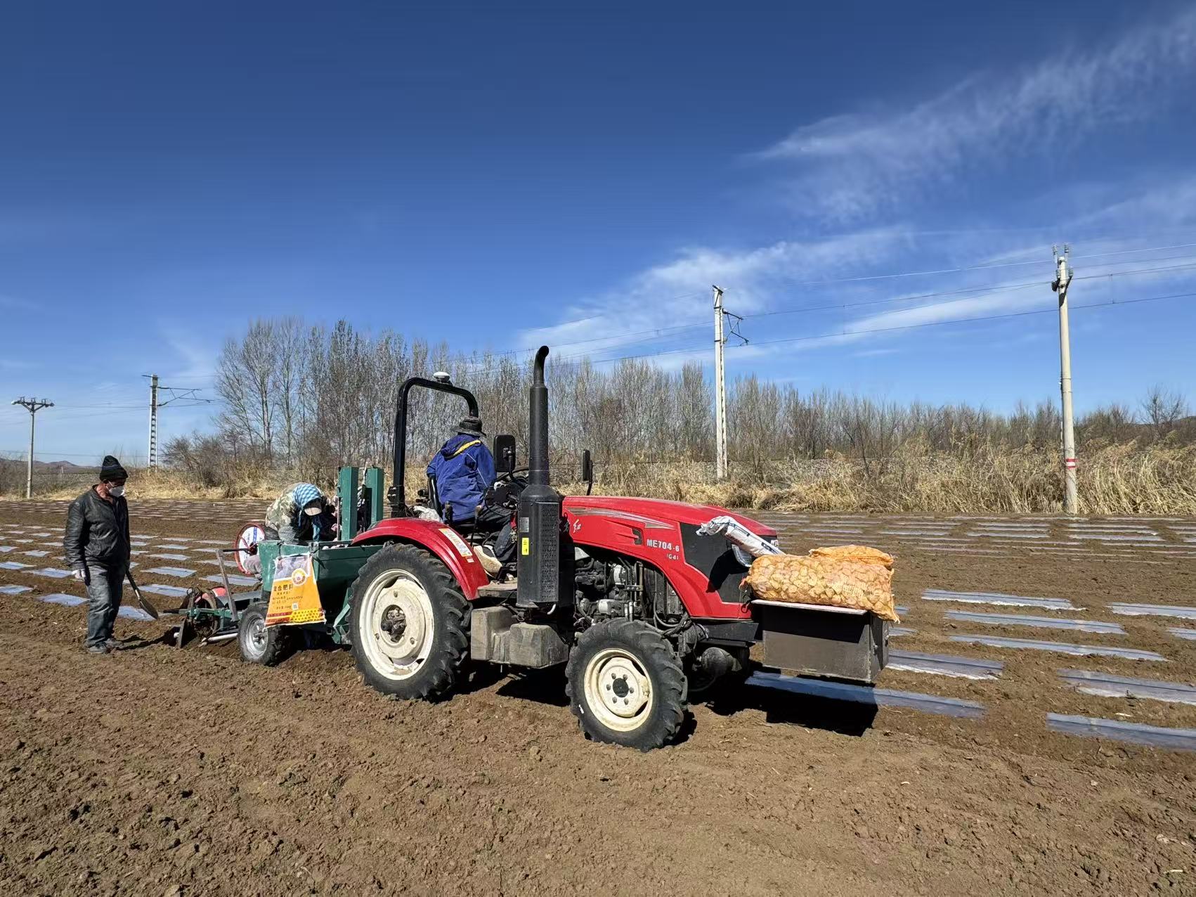 在敖包村田埂间,人工与机械配合默契,一台台播种机匀速穿梭在平整田垄上,精准完成开沟、覆膜、播种、覆土等一系列工序。村民们干劲十足,三五成群、分工协作,紧随机械检查漏播地块、及时补放种块、压实覆盖土壤,书写着春日里的丰收希望。